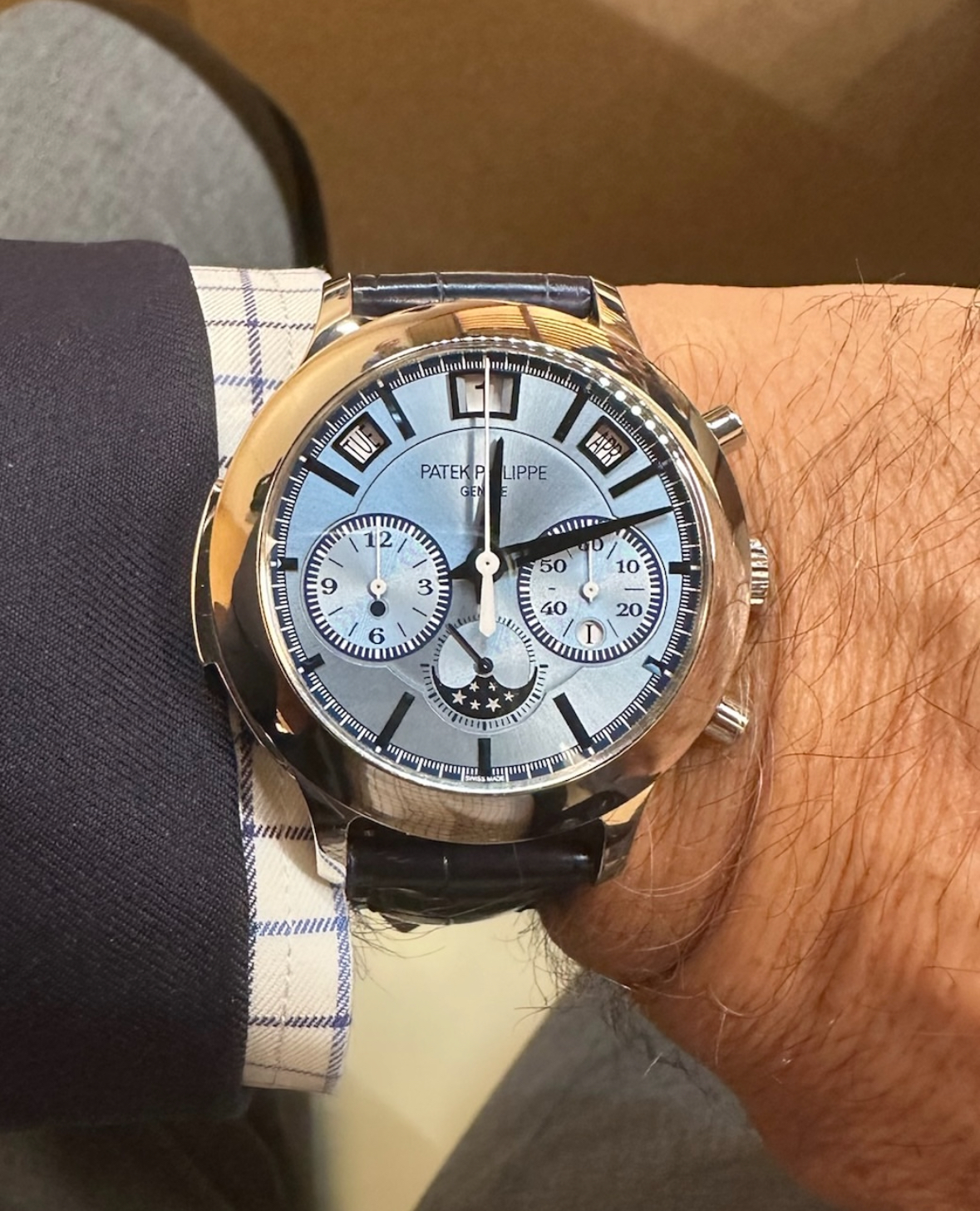 简介:新款四重复杂功能腕表 Ref. 5308G-001 配备优雅的冰蓝色日辉纹表盘,与蓝色金属喷镀处理的白金琢面立体时标和琢面剑形指针相得益彰。