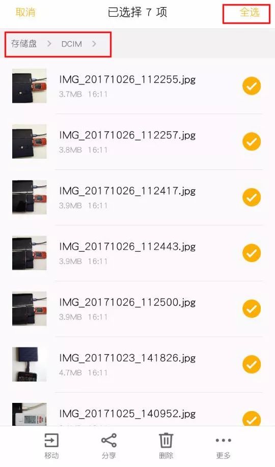 5、在手机存储页面中,照片一般保存在“DCIM”文件夹,找到要复制的照片,先长按一张照片,然后点击右上方的“全选”就可以全选;