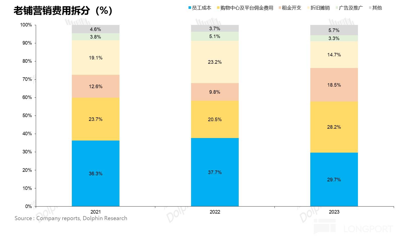 费用上,根据前文分析,门店租金、重奢商场进驻费&平台费、销售人员的薪酬占销售费用超过 90%,其中海豚君假设门店租金、销售人员薪酬等固定成本将随着同店的持续增长进一步摊薄,而商场进驻费&平台费也会随着老铺品牌力的提升逐步下降,最终利润端经营杠杆释放下,从 2025 为起点,未来 4 年老铺利润端接近 40% 的复合增速。