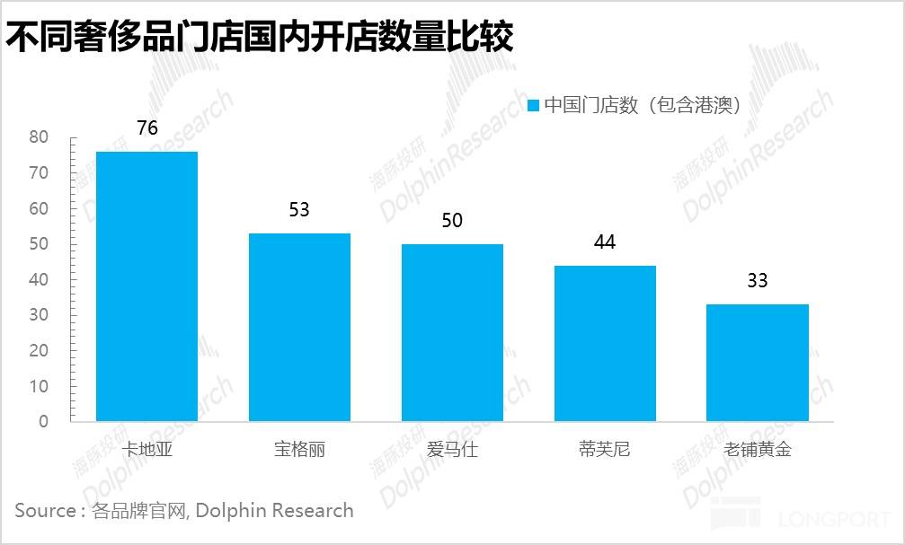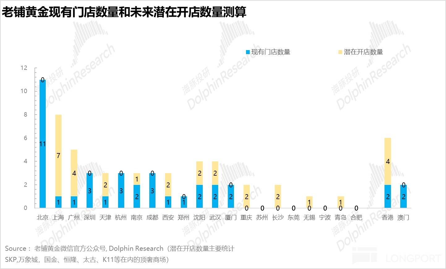 以上一套组合拳打下来,无论是选址、装修还是服务,通过全方位的奢侈品店营销包装,再度强化了老铺高端的品牌,成功建立了老铺的稀缺形象,这也是老铺 100% 坚持自营的底层逻辑。 三、怎么看老铺的长大空间? 强调一点,因目前仍没有做出来奢侈品溢价,它估值判断的核心依旧是对于业绩长大性的判断,从门店层面讲就是,开店空间有多大,以及单店的增长空间有多大。一个一个来说: 1、门店扩张:与奢侈品为邻看空间 对于老铺这种线下开店的生意来说,业绩的驱动因素无非来自开店量和单店营收两部分,我们拆分来看: 首先开店量上其实比较好测算,目前老铺一共 37 家门店,基本分布在一线&新一线城市的各大重奢商圈,对选址有极高要求,花大代价也要与重奢品牌做邻居。 因此,从开店空间上看,为了保持自身的高端调性,未来老铺国内潜在的开店主要还是围绕着新一线城市&一线城市未入驻的重奢商圈展开。 海豚君统计了一线、新一线城市在内的包括 SKP、万象城、国金、恒隆、太古、K11 等所有重奢商圈,从下图可以看到国内老铺未来潜在开店空间应该可以达到 67 家(含港澳),较当前有接近一倍的提升空间,和卡地亚、宝格丽、爱马仕等国际奢侈品在国内的开店数量相近。