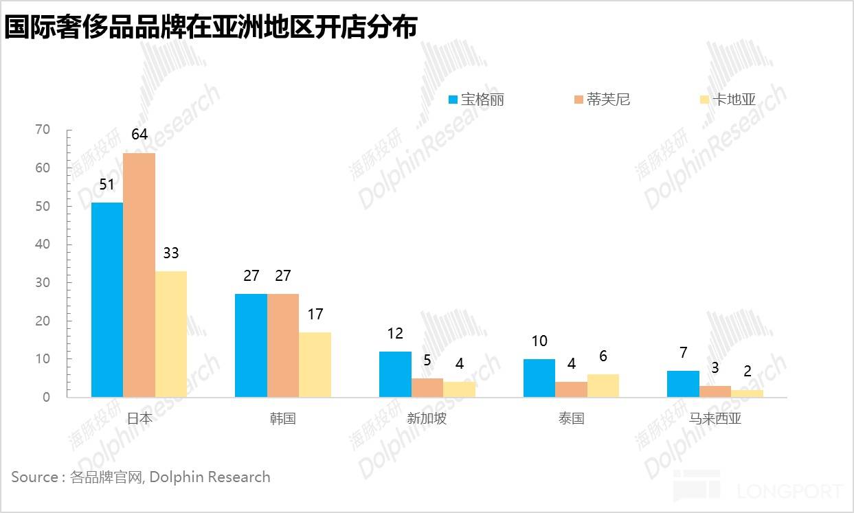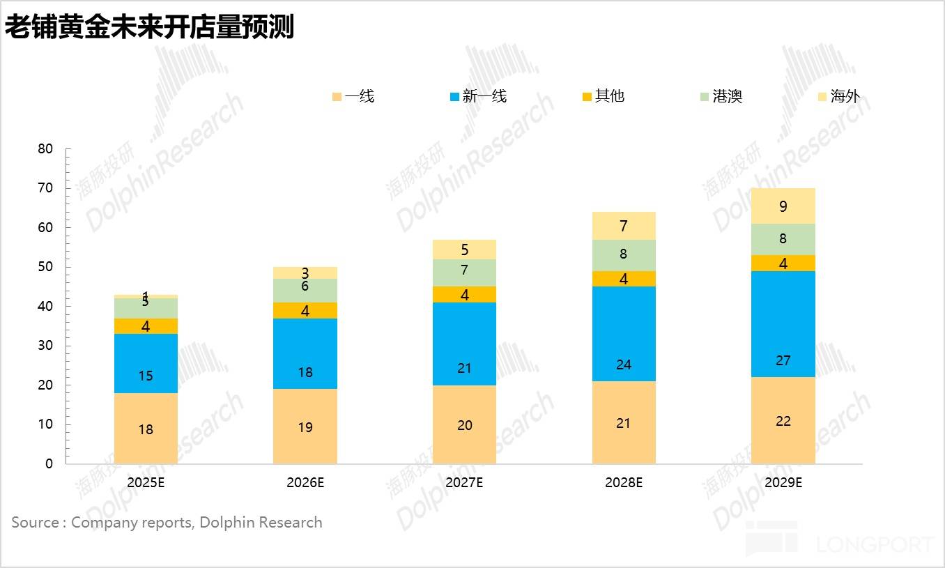 海外方面,老铺的开店思路也很明确:2025 先从东南亚最发达且华人比例占比最高的国家(华人占比接近 80%)——新加坡入手开设第一家海外门店,树立国际标杆,并作为老铺海外品牌力的试金石,为后续东亚文化圈与欧美圈扩张奠定基础。 根据公司业绩会交流,如果新加坡门店经营数据良好,未来 2-3 年内老铺将优先在东南亚地区开设 5 家门店,并后续逐步拓展至日韩、中东、欧美市场。 但由于老铺的出海刚起步,且不同于国内,品牌力尚未得到验证,海豚君这里先不做开店上限的判断,但从下图国际奢侈品品牌在亚洲各国的开店数量可以看出海外的开店潜在空间并不小。 开店节奏上,为了严控稀缺性,避免渠道泛滥,海豚君假设老铺保持少量匀速开店(国内 4-5 家,海外 1-2 家),具体的开店量见下图。 但需要注意的是,无论是国内还是海外,海豚君这里测算的开店空间仅依据重奢商场的数量推演,毕竟当前老铺的品牌力依旧需要重奢商场去赋能。 但如果未来伴随出海,在国际和国内品牌力进一步提升,老铺开设独立门店的可能,但当下的能见度很低,海豚君暂不做考虑。