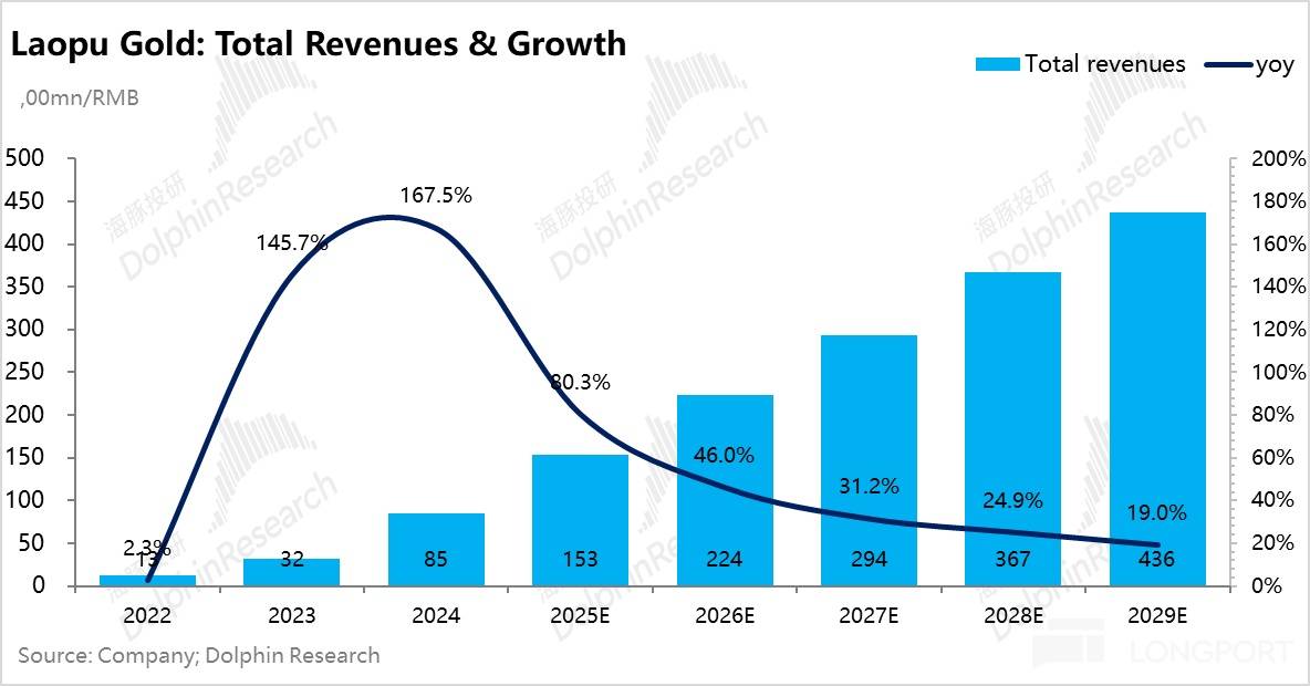2. 单店营收:看齐奢侈品 而从单店营收上看,截至 2024 年,老铺的店均营收为 2.2 亿元,已经接近卡地亚、宝格丽、蒂芙尼的平均店效。且根据渠道调研信息,2025 年一季度部分头部华联 SKP 系门店的单月流水接近 2024 年全年水平,说明当前老铺仍处于品牌扩圈所带来的高净值客户渗透率快速提升阶段。 但另一方面,考虑到老铺的店效经过了 2023、2024 连续两年的翻倍提升,叠加未来老铺在相同地区开店,稀缺性下降也会稀释部分同店营收的增长,因此虽然单店营收的增长依旧是老铺营收的核心驱动,但海豚君假设单店营收增速逐步放缓。 因此,对标当前一线奢侈品包括爱马仕、香奈儿的店均营收(4-5 亿元),海豚君假设未来 4 年伴随老铺人群的持续破圈、开店位置的优化,老铺的平均店效翻倍达到 4.4 亿元。 结合上述开店量和单店营收的预测,我们可以得到这么一组关键数据:如果以 2025 年为基础,不考虑海外所带来的增量,老铺未来 3 年收入端有 34% 的复合增速。