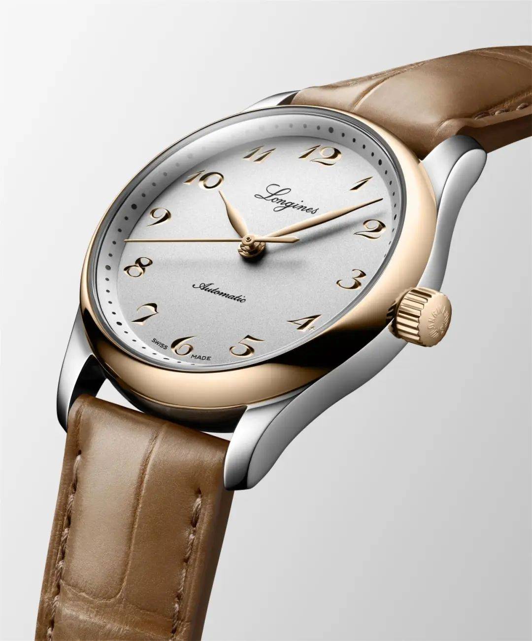 全新浪琴表名匠系列腕表 腕表编号:L2.357.5.70.7 建议零售价:RMB 29,100 名匠系列,充分彰显浪琴表的精湛制表工艺与隽永优雅风格。该表款搭载浪琴表专属机芯L888.5,内置硅游丝与非磁性材质制成的创新组件。自动上链机械机芯透过透明表底盖清晰可见,动力储备可达约72小时。防水深度达 3 巴(30 米),34 毫米直径的双材质表壳覆有 18 K玫瑰金,并配有同色表冠。银色喷砂表盘上,镌刻有12个玫瑰金色阿拉伯数字,搭配同色系的柳叶形指针,用以标示小时。分钟刻度位于表盘边缘处。该表款搭配精钢和玫瑰金的双材质表链,并采用三折式安全表扣和按压开启式装置。